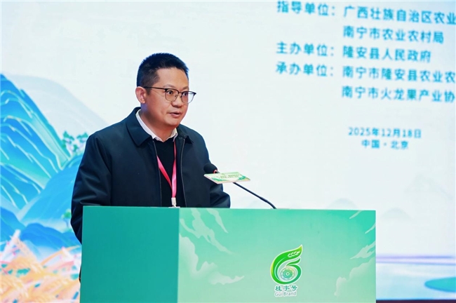 在品牌推介环节,隆安县农业农村局副局长黄方海从种植环境、品质标准、营养价值、产业规模等方面,全面展示了南宁火龙果等特色农产品的核心优势。他指出,南宁火龙果已实现“地理标志、绿色食品、达标合格证”三证齐全,品质可靠、风味独特。