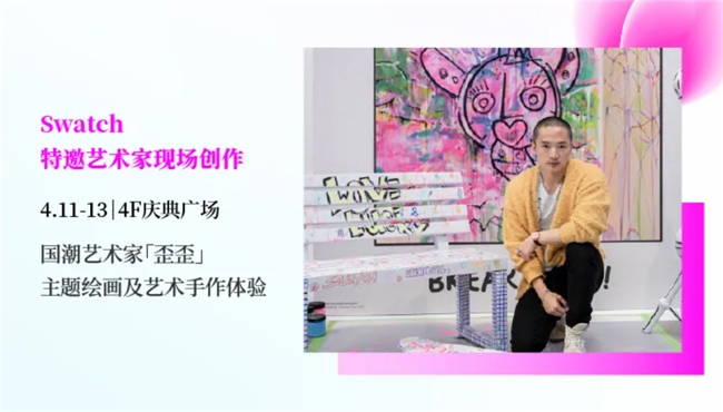 宁波阪急4周年庆期间,特别策划了一系列品牌沙龙活动,为顾客带来与众不同的艺术体验。4月11日至13日,在4F庆典广场,Swatch特邀国潮艺术家"歪歪"进行现场创作,观众不仅可以欣赏到独特的主题绘画,还能参与艺术手作体验。同期在2F 289展区,瑞士斯沃琪将携欧米茄联名系列重磅产品亮相,带来"星球探索奇遇"主题快闪活动,让钟表爱好者近距离感受联名款的魅力。