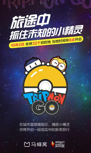 2016年9月27日,“十一”黄金周前夕,马蜂窝未知旅行实验室宣布发起一场覆盖全球的“Tripmon GO”活动,号召所有”十一”出行者,在旅途中寻找马蜂窝的“Tripmon小精灵”。10月2日8点至10月3日8点,未知旅行实验室放出39种小精灵,分散在全球32个热门旅游目的地,如东京、首尔、清迈、迪拜、巴厘岛、圣托里尼、北京、上海、广州等。“Tripmon GO”借势于火遍全球的AR游戏Pokémon GO,不同的是,这一次,人们在旅途中遭遇的“小精灵”,将是现实旅行中的一系列未知当地旅行体验。