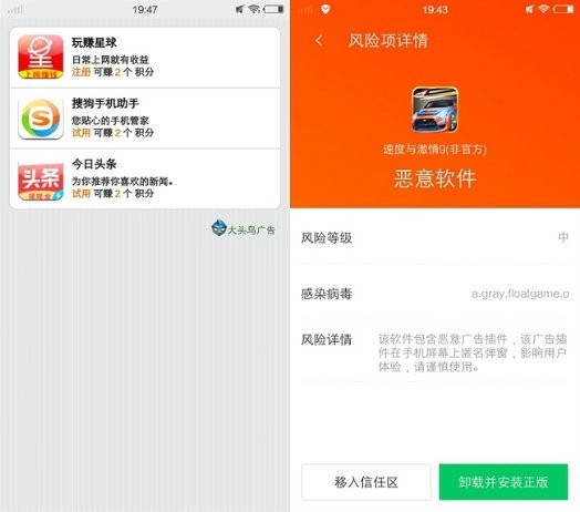 此外,根据腾讯手机管家病毒查杀记录显示,张先生下载的“速度与激情9”非官方版,并包含广告插件,针对第三方应用进行流氓推广,影响体验的同时造成了资费消耗。