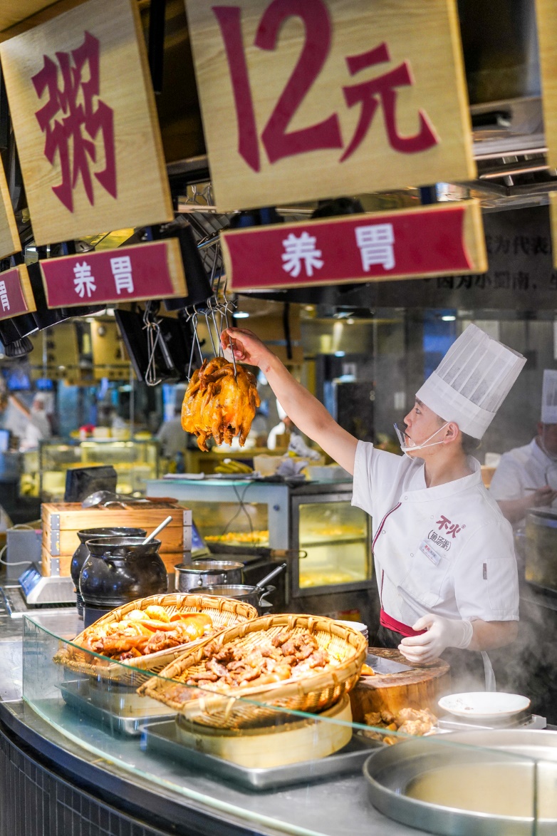如何使一碗粥,变成一餐好饭。使吃粥成为年轻人在外就餐全天候的选择?彭昊航根据四川人饮食习惯,为“鱼汤粥”找到了最佳佐餐伴侣——宜宾川南卤肉。宜宾川南卤肉当地人又称“烧腊”,源于宜宾江安县,曾有吃过“江安烧腊,天下再无卤”之称。传承“卤三泡十”传统技艺,卤肉油润饱满,香而不腻。所有卤菜采用明档鲜卤现切,绝不过夜,新鲜健康看得见。再搭配上四季青菜与开胃小菜,无论是一人食还是三两朋友搭伴聚餐,人均消费不过30多元,口味丰富荤素合理,性价比超高。