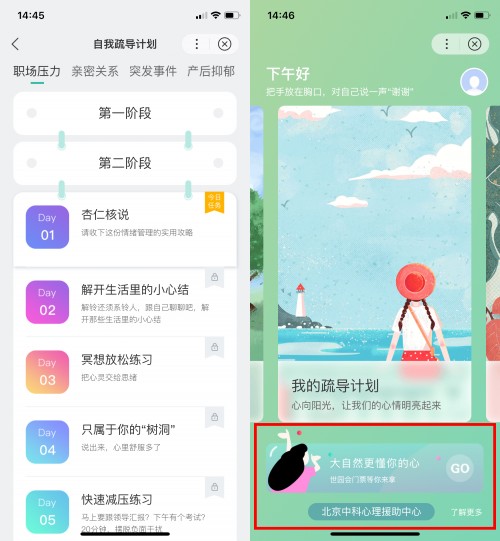 女性用户可在小程序中针对自己在不同场景下的心理状况进行测试,根据测试结果,选择合适的“21天专业女性心理健康疏导计划”。疏导计划的呈现方式符合移动端使用习惯,以每日一个心理疏导任务、每7天一个阶段计划的形式鼓励用户“打卡”,加强心理疏导的长期功效。
