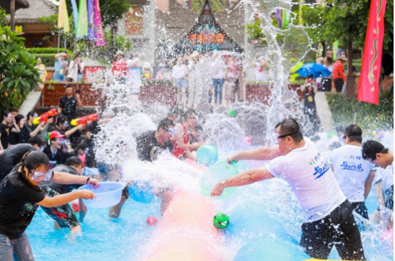 ▲游客在南宁方特东盟神画参与“巴厘岛泼水节”。