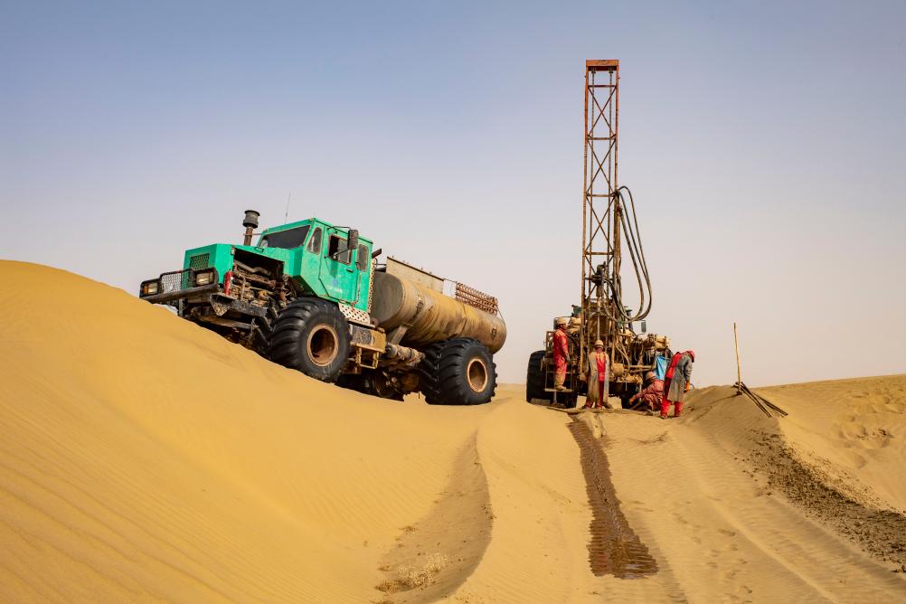 物探工人在塔克拉玛干沙漠中钻井。新华社记者 胡虎虎 摄