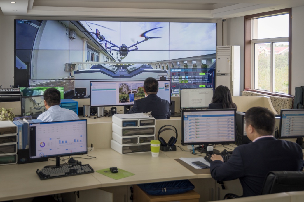 对于无人机,人们并不陌生,常见的景象是,飞手通过遥控设备来操控无人机,遥控距离有限。而在中兴镇,无人机会自动定时起飞、巡查,只要电量够,会飞得足够远,突破遥控距离限制。在需要操控时,工作人员不管身在何处,只要能接入网络,然后就能进入飞控平台来操作无人机。
