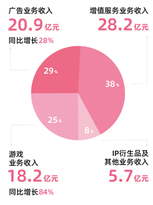 至此,B站的收入结构形成了相对均衡的状态。本季度,B站增值服务、广告、游戏和IP衍生品及其他业务分别贡献了收入的38%、29%、25%和8%。